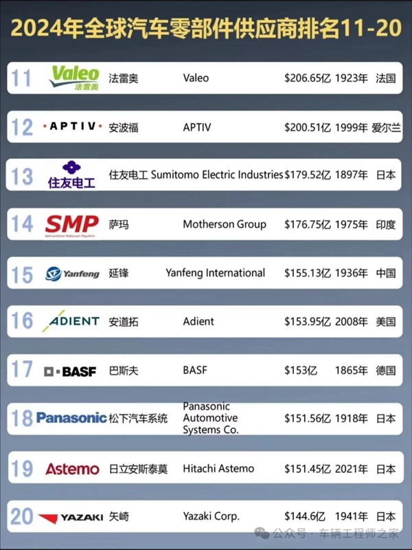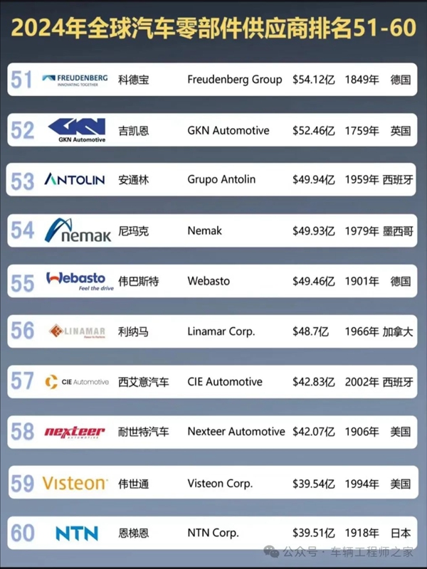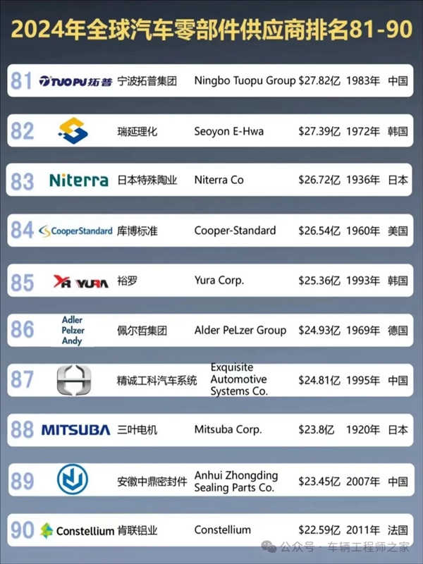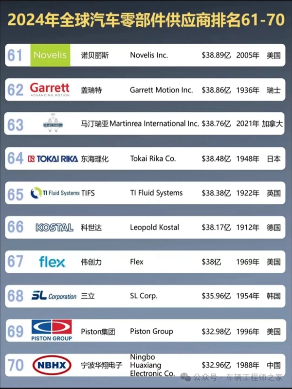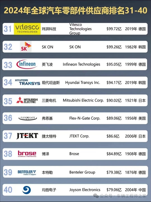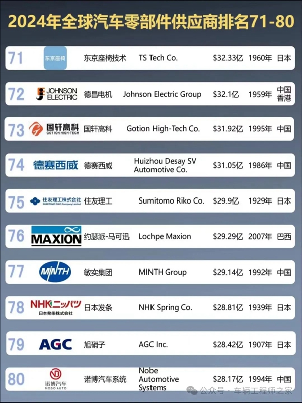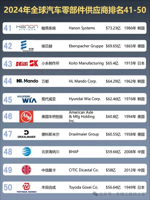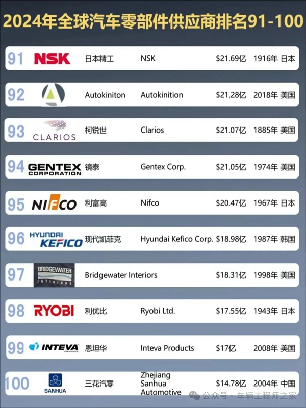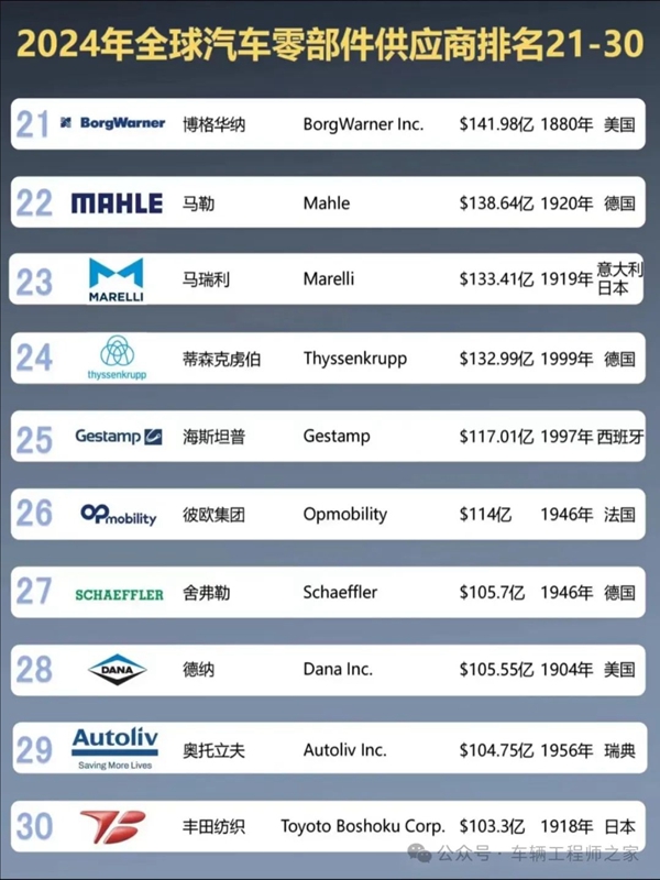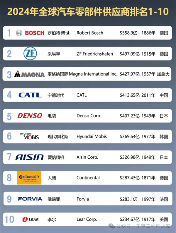 从排名前10的企业来看,德国的博世(Bosch)以558.9亿美元的营收稳居榜首,其悠久的历史和强大的研发实力令人瞩目。采埃孚(ZF Friedrichshafen)、麦格纳国际(Magna International Inc.)、宁德时代(CATL)等企业紧随其后,它们分别来自德国、加拿大和中国,展现了不同国家在汽车零部件供应领域的竞争力。值得一提的是,宁德时代作为唯一一家进入前10的中国企业,彰显了中国在新能源汽车零部件领域的快速崛起。 在11~20名的企业中,法雷奥(Valeo)、安波福(APTIV)等企业也表现出强大的实力。这些企业分布在法国、爱尔兰等国家,各自在汽车零部件的不同细分领域有着深厚的技术积累。 而在21~30名的企业中,博格华纳(BorgWarner Inc.)、马勒(Mahle)等企业的名字映入眼帘。这些企业的业务涵盖了汽车动力系统、底盘系统等多个关键领域,是汽车行业不可或缺的一部分。 从国别来看,德国和日本的企业在榜单中占据了显著的位置。德国企业以其精湛的机械制造技术和严谨的工业精神著称,而日本企业则以其精密的电子技术和高效的生产管理闻名。此外,韩国、美国、中国等国家的企业也在榜单中占据了重要的份额,反映了这些国家在汽车零部件供应领域的快速发展。 随着新能源汽车和自动驾驶技术的快速发展,汽车零部件供应商也面临着新的机遇和挑战。未来,能够在这些新兴领域取得技术突破的企业,无疑将在全球汽车零部件供应市场中占据更加重要的位置。这份2024年全球汽车零部件供应商百强榜单,不仅仅是一份排名,更是汽车行业发展的一个缩影,它展示了行业巨头的实力,也预示着新兴力量的崛起。 来源:车辆工程师之家、汽车制造网、模具网 编辑:陈亚男 审核:李建兵 |