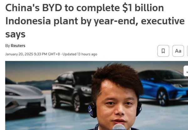 据路透社消息,近日,中国最大的电动汽车制造商比亚迪的印尼子公司负责人表示,其计划在2025年底前完成在印度尼西亚的工厂建设,该工厂总投资额达10亿美元。