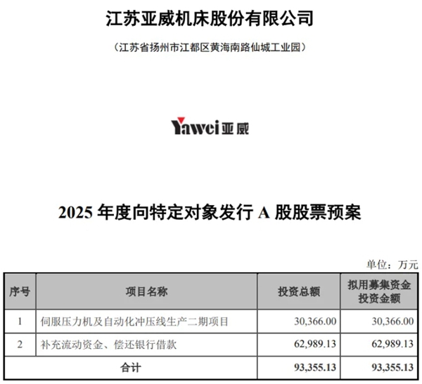 1月21日,亚威股份发布《2025年度向特定对象发行A股股票预案》公告。据公告内容显示,亚威股份本次向特定对象发行股票的发行对象为扬州产业投资发展集团有限责任公司。