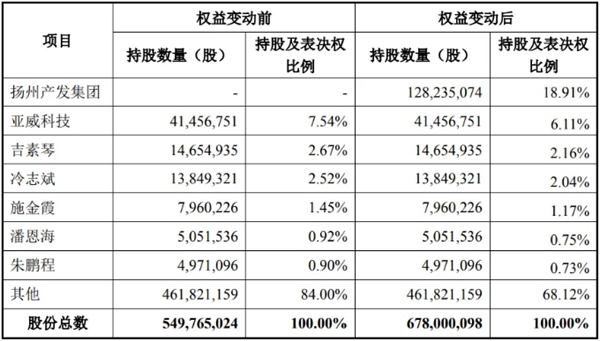 假设自本次发行董事会决议公告日至发行日公司总股本不变,本次发行完成后,扬州产发集团通过认购上市公司向特定对象发行股票的方式,将持有亚威股份 128235074股股票,占发行完成后上市公司股份的比例为18.91%(剔除回购专用证券账户股份数量影响,占比为19.09%)。 根据2025年1月20日扬州产发集团与亚威股份主要股东亚威科技、吉素琴、冷志斌、施金霞、潘恩海、朱鹏程签订的《合作框架协议》,本次发行完成后,将对亚威股份董事会进行改组,改组后的董事会人数仍为9名,其中扬州产发集团有权提名或推荐5名非独立董事和2名独立董事候选人。