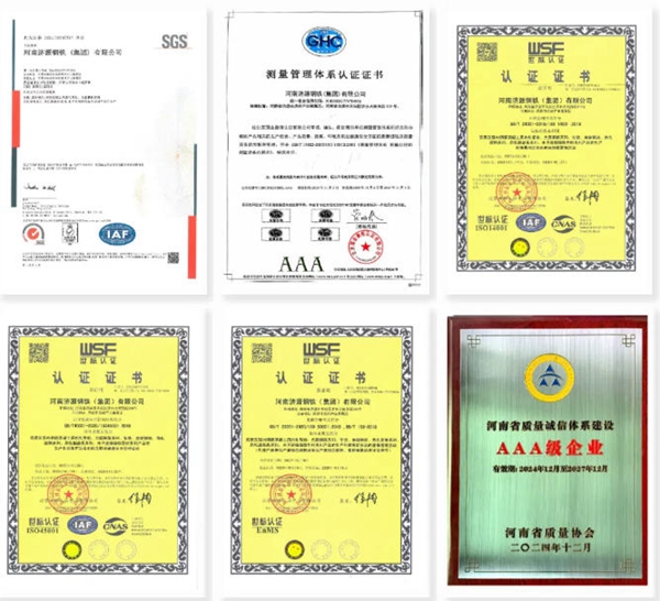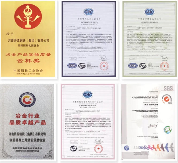 在河南省内份额占到80%以上,基本覆盖了如宇通客车、郑煤机、洛轴、洛阳一拖、许昌远东、红阳精工、巩义恒星等大中型重点企业。 集团荣誉 技术认证 济钢集团拥有一流的实验检测装备和雄厚的研发实力,是河南省特殊钢材料创新中心、省级技术中心、国家级认可实验室和博士后研发基地,相继获得了质量、环境、安全等相关管理体系以及中国船级社工厂等认证。