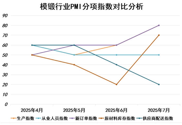 为精准研判我国锻压行业市场运行趋势,中国锻压协会于2025年正式开展了行业市场运势与PMI(采购经理指数)调查工作,以下为2025年7月模锻行业PMI分析报告。 分析指数对比分析 PMI综合指数:72.0(较5月51.0上涨21.0),大幅升至扩张区间高位,反映行业活动明显加速。 ![]() 数据来源:中国锻压网 关键变化解读 生产活动强劲反弹: