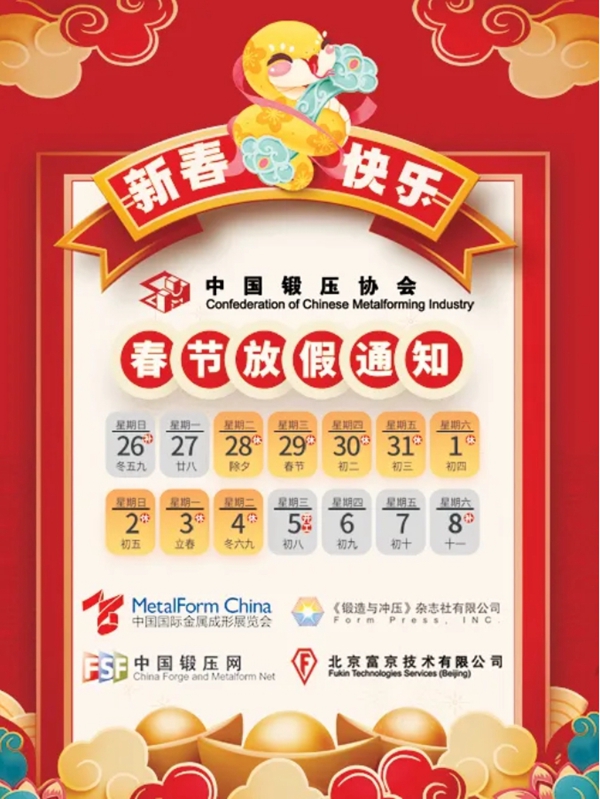 中国锻压协会秘书处放假安排1月28日-2月4日放假。 1月26日、2月8日(周六)上班节日期间值班电话:13021030344。敬请联系。 在充满挑战与机遇的2024年,在广大行业同仁的关注与支持下,中国锻压协会系统圆满完成各项工作。 值此新春佳节到来之际 中国锻压协会秘书处 北京富京技术有限公司 《锻造与冲压》杂志社有限公司 中锻智能装备设计院(青岛)有限公司 国开金联供应链管理(北京)有限公司 全体工作人员恭祝大家:所营皆昌盛 所愿皆成真!来源:中国锻压协会服务平台 编辑:陈亚男 审核:李建兵 |
