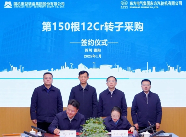 1月7日,第150根高铬转子锻件采购项目签约仪式在东方电气集团东方汽轮机有限公司(简称东方汽轮机)举行。国机重装所属二重装备与东方汽轮机签署《合作框架协议》,为其批量提供高铬转子锻件。