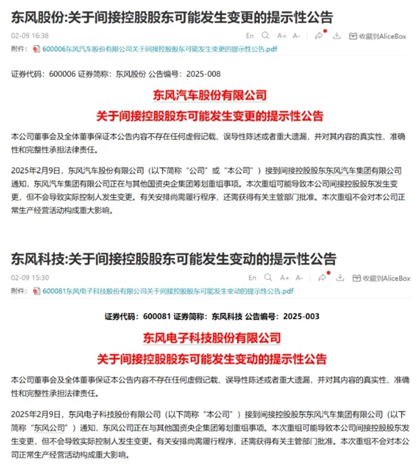 日前,东风系、兵装系上市公司密集公告。 2月9日,多家东风系和兵装系上市公司发布公告称,其间接控股股东/控股股东或发生变更。公告显示,东风汽车集团有限公司(以下简称“东风公司”)、中国兵器装备集团有限公司(以下简称“兵器装备集团”)正在与其他国资央企集团筹划重组事项,但公司公告同时强调,不会导致实际控制人发生变更。公开资料显示,东风公司和中国兵器装备集团均为国资委下属中央企业。 上诉公司公告均显示,本次重组事项,尚处于筹划阶段,有关事项具有不确定性。有关安排尚需履行程序,还需获得有关主管部门批准。 东风系公司密集公告 东风股份(600006)、东风科技(600081)2月9日晚发布公告称,东风公司正在与其他国资央企集团筹划重组事项。本次重组可能导致本公司间接控股股东发生变更,但不会导致实际控制人发生变更。