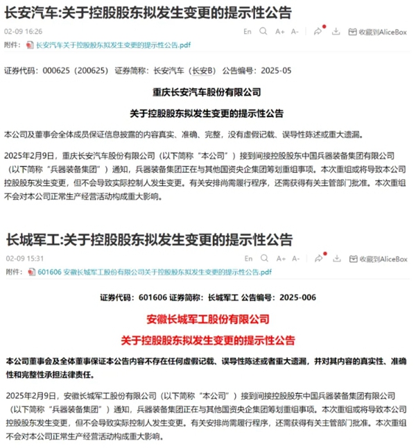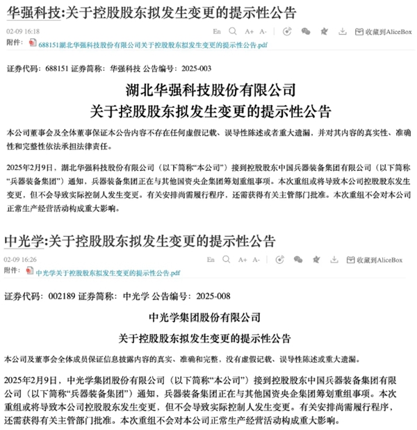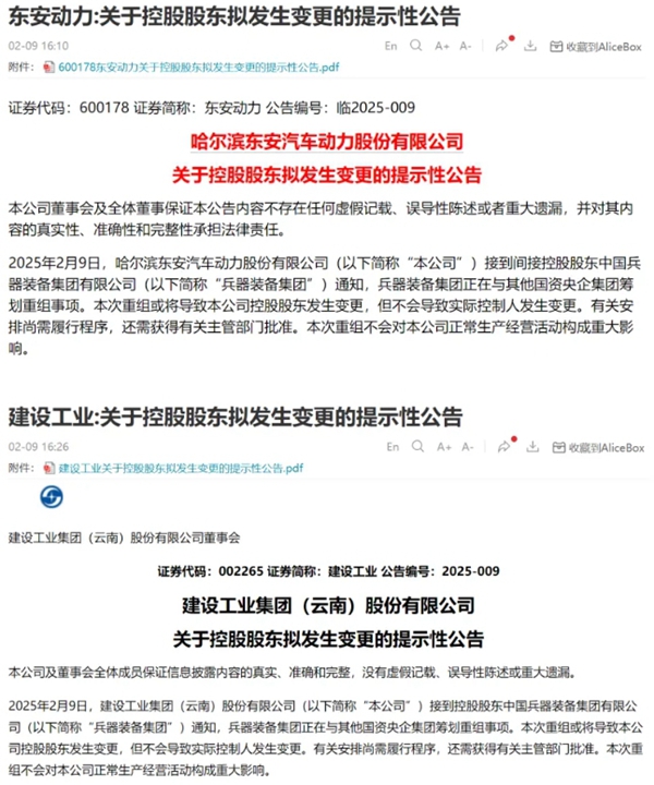 公开资料显示,东风公司是以汽车制造、销售、服务和技术研发为主业的商业一类央企,前身是始建于1969年的第二汽车制造厂(简称二汽)。50多年来,累计产销汽车近6000万辆,上缴税费6700多亿元。截至2023年,公司资产总额5210亿元,从业人数12.1万人。2023年,公司销售汽车242万辆,营业收入4103亿元,经营规模居国内汽车行业前列、居世界500强第188位。 兵装系上市公司密集公告 同一天,长安汽车(000625)、长城军工(601606)、哈飞动力(600178)、建设工业(002265)、华强科技(688151)、中光学(002189)等多家兵器装备集团旗下公司发布公告,兵器装备集团正在与其他国资央企集团筹划重组事项。本次重组或将导致公司控股股东发生变更,但不会导致实际控制人发生变更。