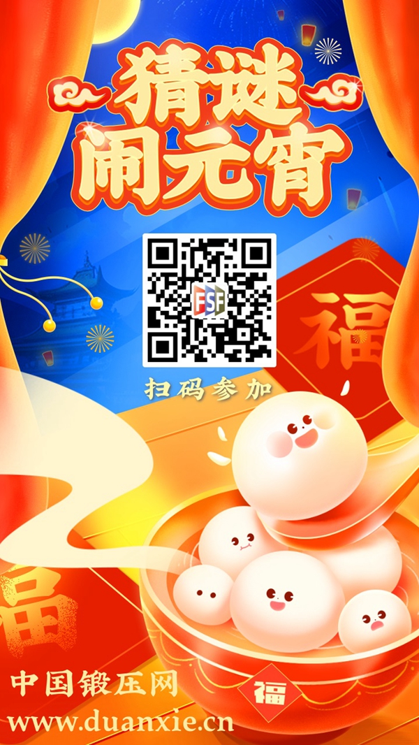 灯火映万家,良宵共团圆。值此元宵佳节,中国锻压网特举办线上猜灯谜活动,诚邀大家云端猜灯谜,欢乐闹元宵! 扫描下图二维码,参加猜谜 ▼