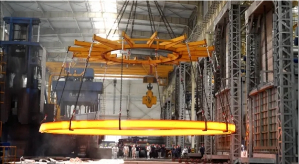 2022年两件直径15.6米的“乾坤圈”在伊莱特股份有限公司成功下线,是用于我国某四代核电机组上的巨型锻件,承载着核电机组堆容器7000吨的重,这个重量相当于‘乾坤圈’脑袋上顶着100节动车组的重量。