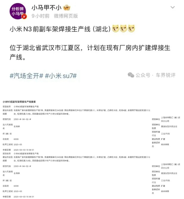 近日,关于“小米N3前副车架焊接生产线备案”的截图在社交媒体上广泛流传,引发业界热议。不过项目地点不在武汉经开区,而在江夏区。![]() 根据截图信息,该项目总投资额为6000万元,属于扩建项目,由上海本特勒汇(武汉分公司)负责实施,项目代码为2503-#-04-02#2。项目位于湖北省武汉市江夏区,计划在现有厂房内扩建焊接生产线,新增7条焊接生产线、34台焊接单元(含68个焊接机器人)、12台搬运机器人及8台检测机器人等设备,建成后预计年产小米N3前副车架30万套。项目已于2025年3月3日完成备案审批,拟于2025年5月开工,当前备案状态尚未审核。