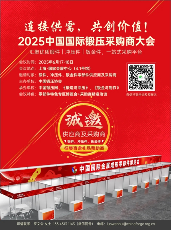 为促进锻造、冲压及钣金与制作行业供应商与相关采购商之间的需求交流,中国锻压协会定于2025年6月17-18日在中国上海举办“2025中国国际锻压采购商大会”(以下简称“采购会”)暨“2025中国国际锻造、冲压和钣金与制作零部件采购洽谈会(对接交流会)”。本次行业盛会以"精准对接•智造未来"为主题,致力打造全球锻造产业链高效对接平台。
