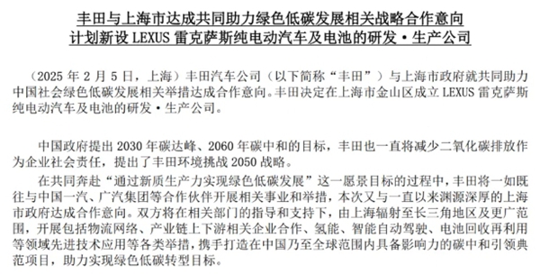 4月22日,上海市政府与丰田汽车公司正式签署战略合作协议,金山区政府与丰田中国签署合作备忘录,金山区新金山发展公司与雷克萨斯(上海)新能源有限公司签署投资服务协议。 ![]() 雷克萨斯新能源项目是丰田汽车公司电动化发展战略的重要布局,随着此次战略合作协议的签署,意味由丰田汽车独资设立的雷克萨斯纯电动汽车及电池的研发生产公司在上海市金山区正式落地。