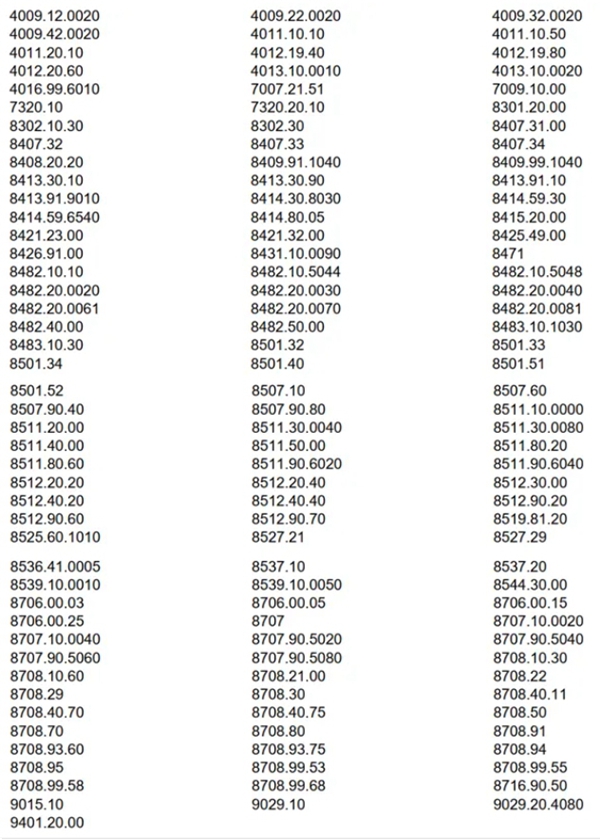 以下进口至美国的产品将会被加征25%关税:乘用车(轿车、SUV、多用途车、小型货车和货车等)和轻型卡车等,上述产品一般归入以下美国海关商品编码HTSUS: