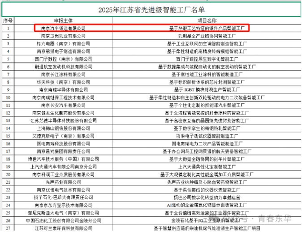 近日,江苏省工业和信息化厅公示了2025年江苏省先进级智能工厂,南京汽车锻造有限公司名列榜首。