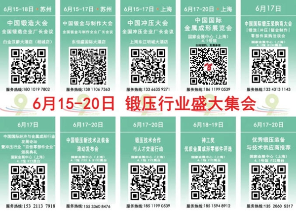 核心活动 (上海国家会展中心-4.1号馆) ●6月17-20日 中国国际金属成形展览会 三大会议 ●6月15-18日 2025中国锻造大会--全国锻造企业厂长会议(苏州白金汉爵大酒店-相城店) ●6月15-17日 2025中国冲压大会- -全国冲压企业厂长会议(上海东江明城大酒店) ●6月15-17日 2025中国钣金与制作大会---全国钣金与制作企业厂长会议(苏州东恒盛国际大酒店) 精彩配套活动 (上海国家会展中心-4.1号馆) ●6月17日 中国国际金属成形展览会开幕式 ●6月17日 2025中国国际经济与金属成形行业发展论坛--中国国际锻造会议与中国国际金属成形会议 ●6月17日 2025中国冲压行业“百佳零部件企业”颁奖典礼 ●6月17日 2025中国锻压采购商大会--中国国际锻造、冲压和钣金与制作零部件采购洽谈会(对接交流会) ●6月17-20日 2025“神工奖”--优质金属成形零部件评选 ●6月17-20日 2025中国国际金属成形展最佳合作伙伴 ●6月17-20日 2025锻造、冲压、钣金与制作技术装备“金钻奖”评选及颁奖 ●6月17-20日 2025优秀装备与技术供应商推荐 ●6月18-19日 2025新技术及装备滚动发布会--锻造、冲压、钣金制作、工模具和连接焊接新技术及装备滚动发布会 ●6月17-20日 2025技术合作与人才交流行动--高校、研究院所与企业之间的技术项目对接与人才推介行动 ●6月17-20日 “第二届全国智能钣金制作行业职业技能竞赛”作品展 ![]() 扫描对应二维码,可对接各活动