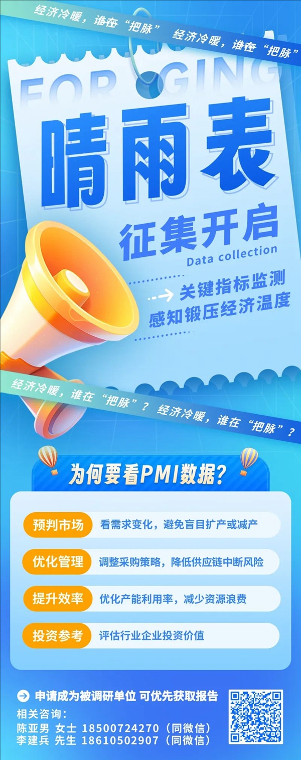 目前,我国锻压行业尚缺乏系统、权威的PMI数据支持,导致企业决策依赖经验而非数据。为此,中国锻压协会启动模锻、自由锻、冲压及钣金与制作行业市场运势与PMI调查,呼吁行业同仁共同建立首个锻压经济监测体系! ![]() 相关咨询 陈亚男 女士 手机:18500724270 邮箱:chenyanan@chinaforge.org.cn 李建兵 先生 手机:18610502907 邮箱:lijianbing@chinaforge.org.cn 编辑:陈亚男 审核:李建兵 |
