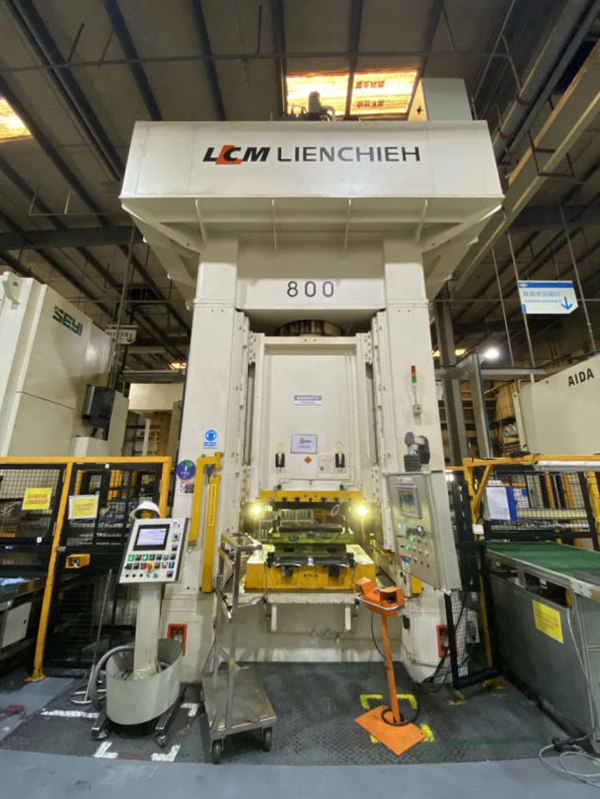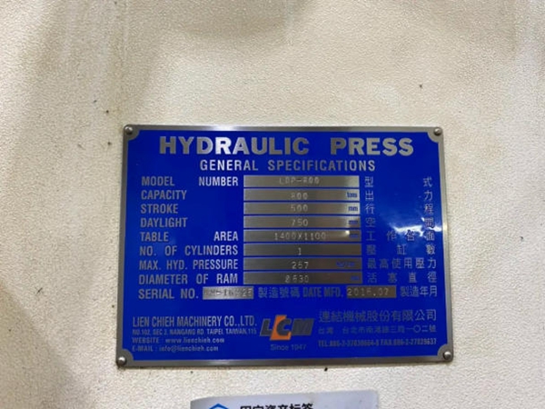 部分设备清单及照片 品牌 LCM LIENCHIEH;型号 LDP-800; 序列号 KM-16325;生产日期 2016;数量 1; 公称压力 800T,行程 500mm,工作台面至压盘面最大开口 750mm; 工作台面至压盘面最小开口 250mm; 工作台尺寸 1400 x 1100mm。