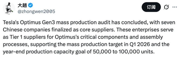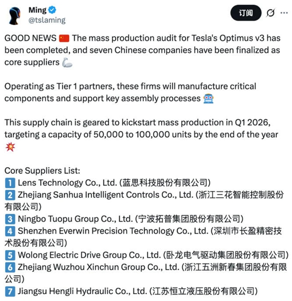 上月底,特斯拉针对Optimus机器人的在中国供应链审厂工作完成,目标直指2026年的规模化量产,最终7 家中国公司被最终确定为核心供应商,负责关键零部件的制造以及核心装配环节的支持。