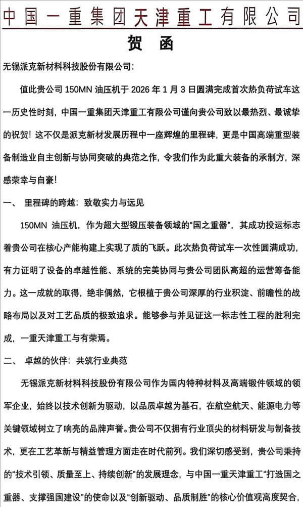 近日,由中国一重为无锡派鑫航空科技有限公司量身打造的超大型关键装备——150MN(1.5万吨)油压机圆满完成首次热负荷试车,这是中国一重在超大型锻压装备领域缔造的又一里程碑,也是我国高端重型装备制造业自主创新能力与全产业链协同攻坚实力的集中彰显。